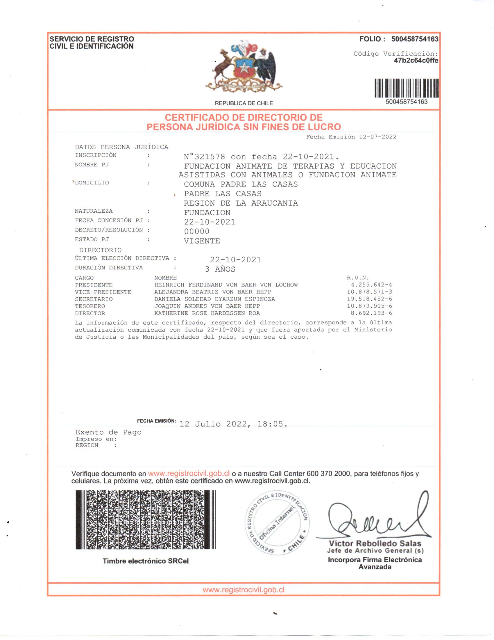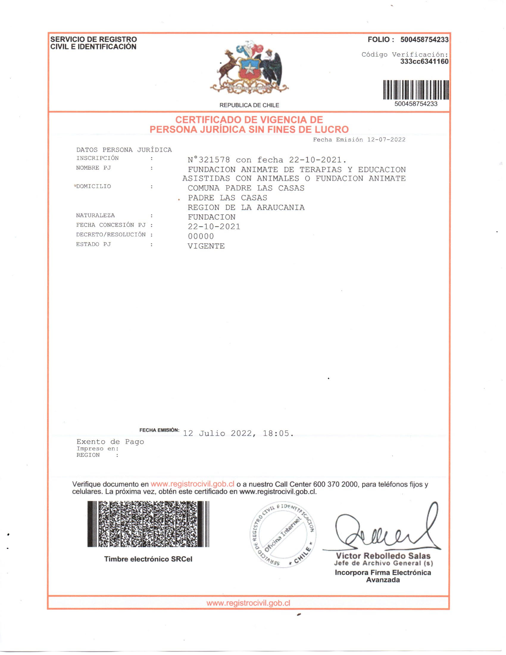 | Número de inscripción y registro | 321578 |